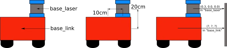 위의 그림처럼 laser sensor가 로봇의 중심인 base_link에서 앞으로 10cm, 위로 20cm 위치에 장착되어 있다고 가정하자. 이 정보를 통해 base_link에서 base_laser로 변환할 때의 Translation Offset을 정의할 수 있다. base_link에서 base_laser로 데이터를 변환하려면, 다음과 같은 이동(translation; x축 0.1m, y축 0.0m, z축 0.2m)을 적용해야한다. 역으로 base_laser에서 base_link로 변환시에는 반대 방향으로의 이동(translation; x축 -0.1m, y축 0m, z축 -0.2m)을 적용해야 한다.